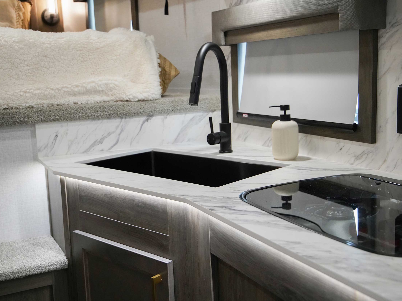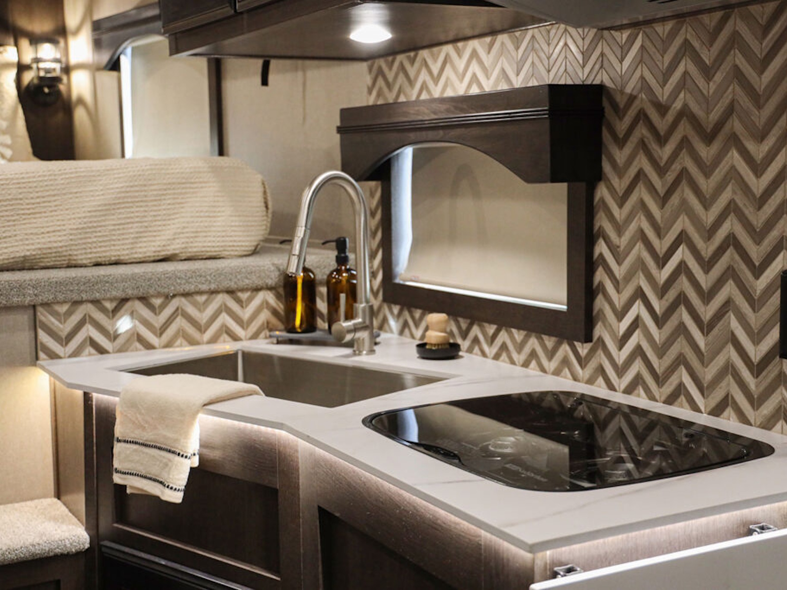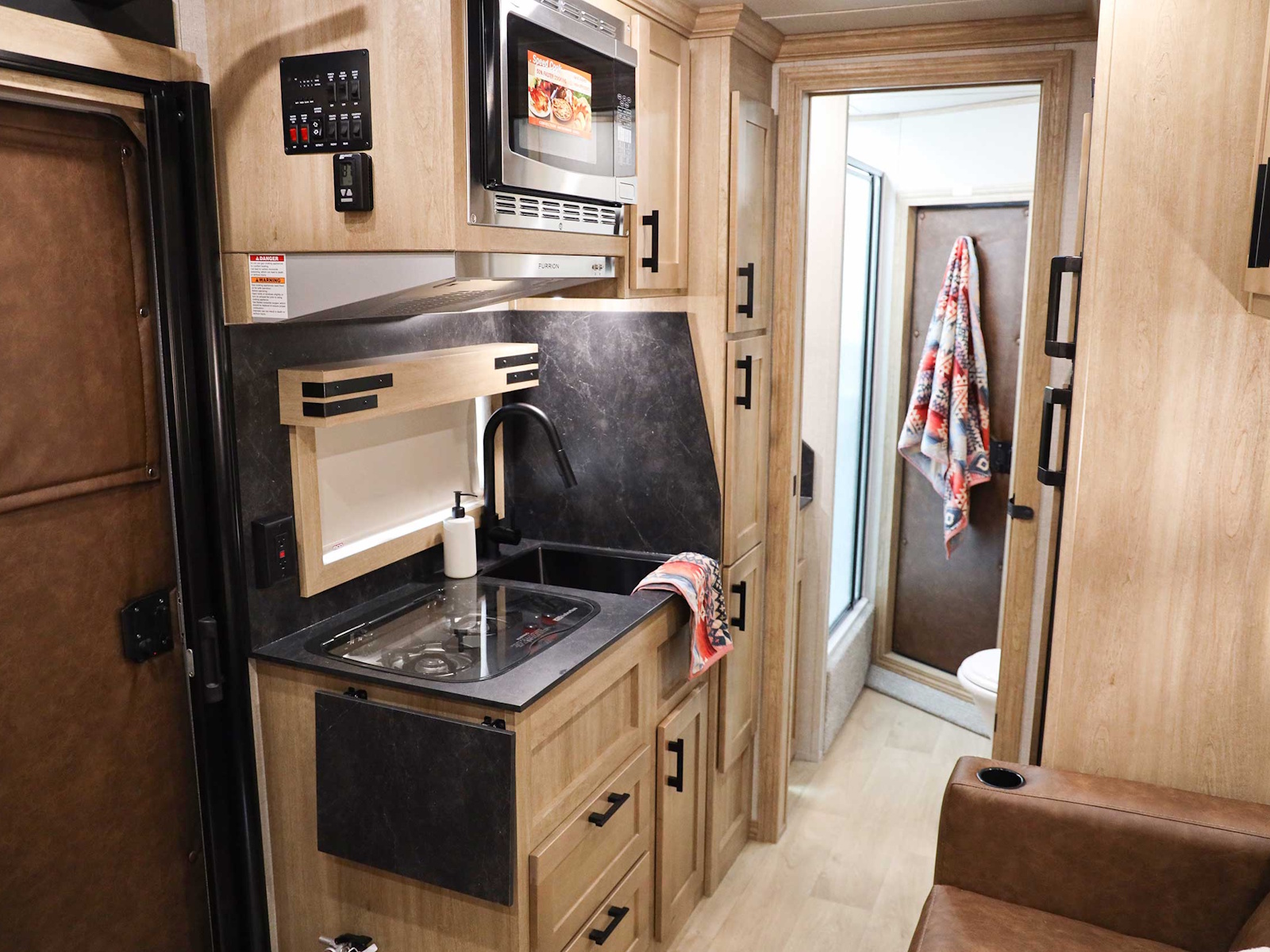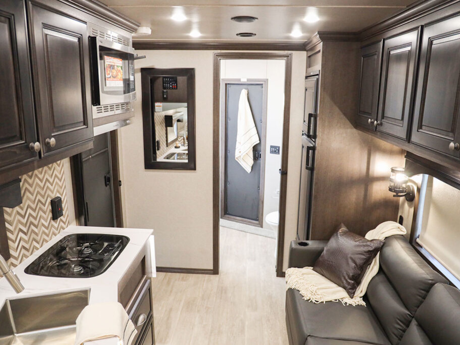 - Exiss living quarters feature an upgraded, larger convection microwave standard, which gives horse owners even more convenience and cooking options when traveling. The kitchen sink is a deep, extra large undermount style with stylish, upgraded faucets. And the recessed stainless steel cooktop stove is convenient and provides an additional flat surface for additional counter space.