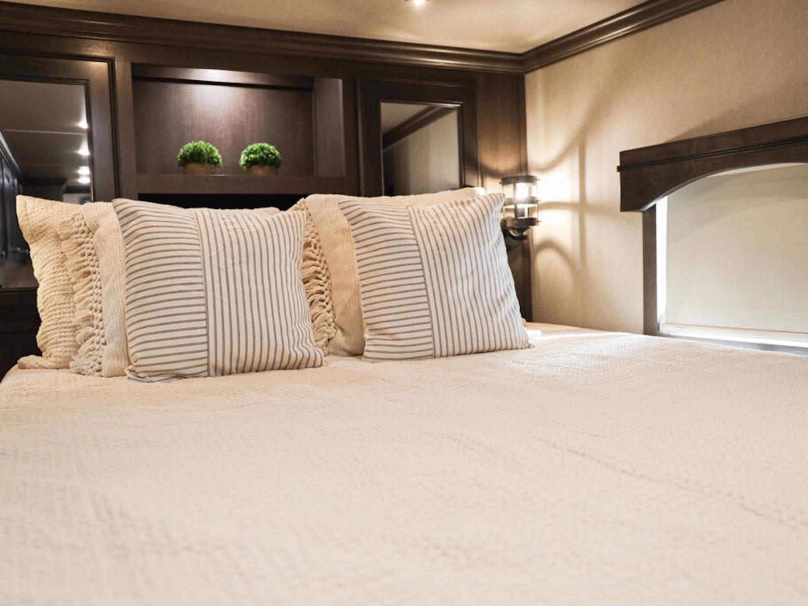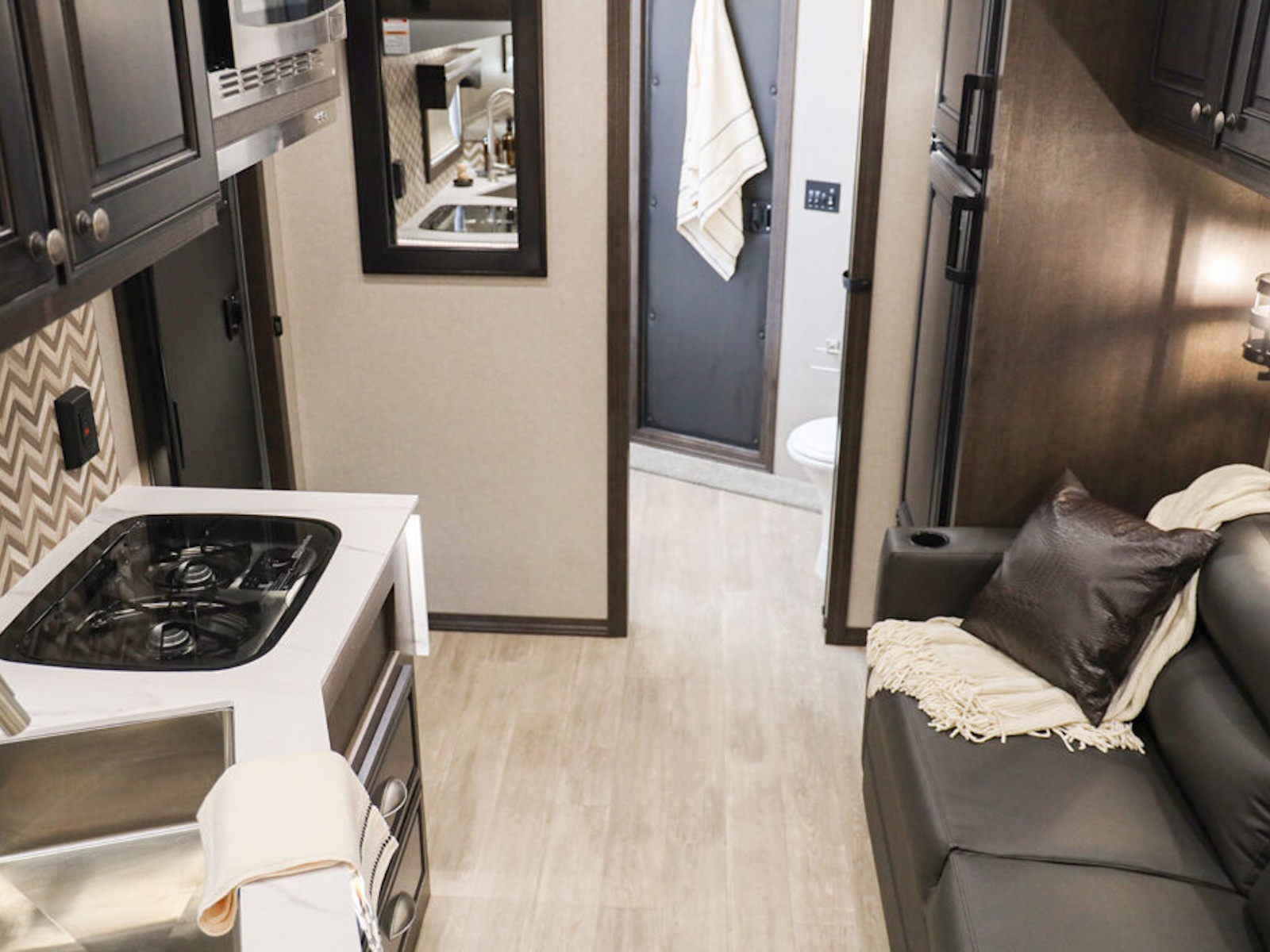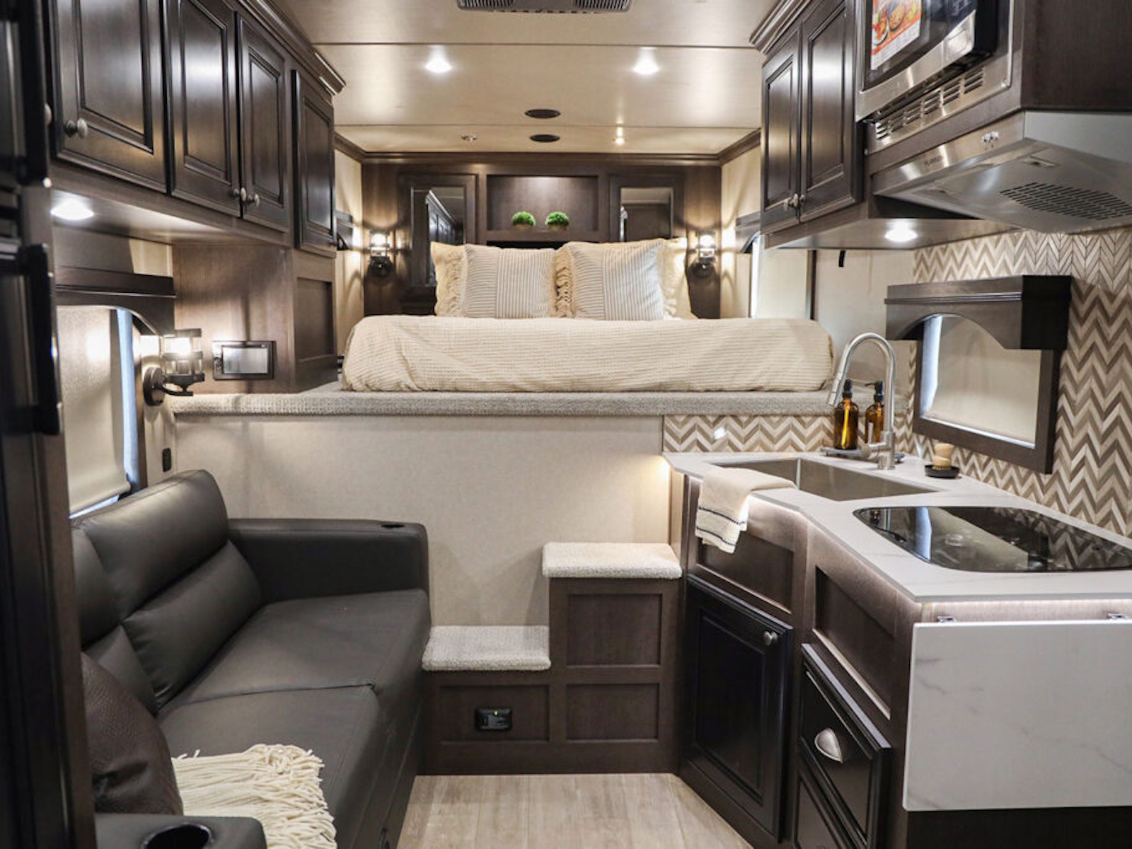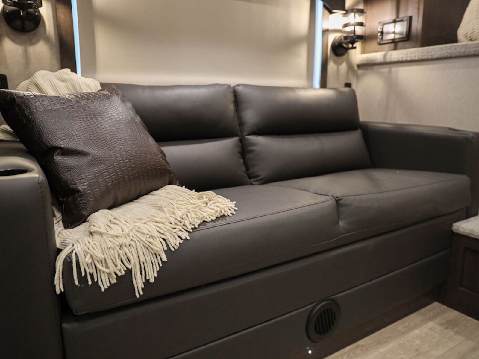 - Exiss living quarters now come with our redesigned sofas. These modern sofas feature cupholders with USB chargers behind the sofa. They easily fold down for extra sleeping space inside the interior.