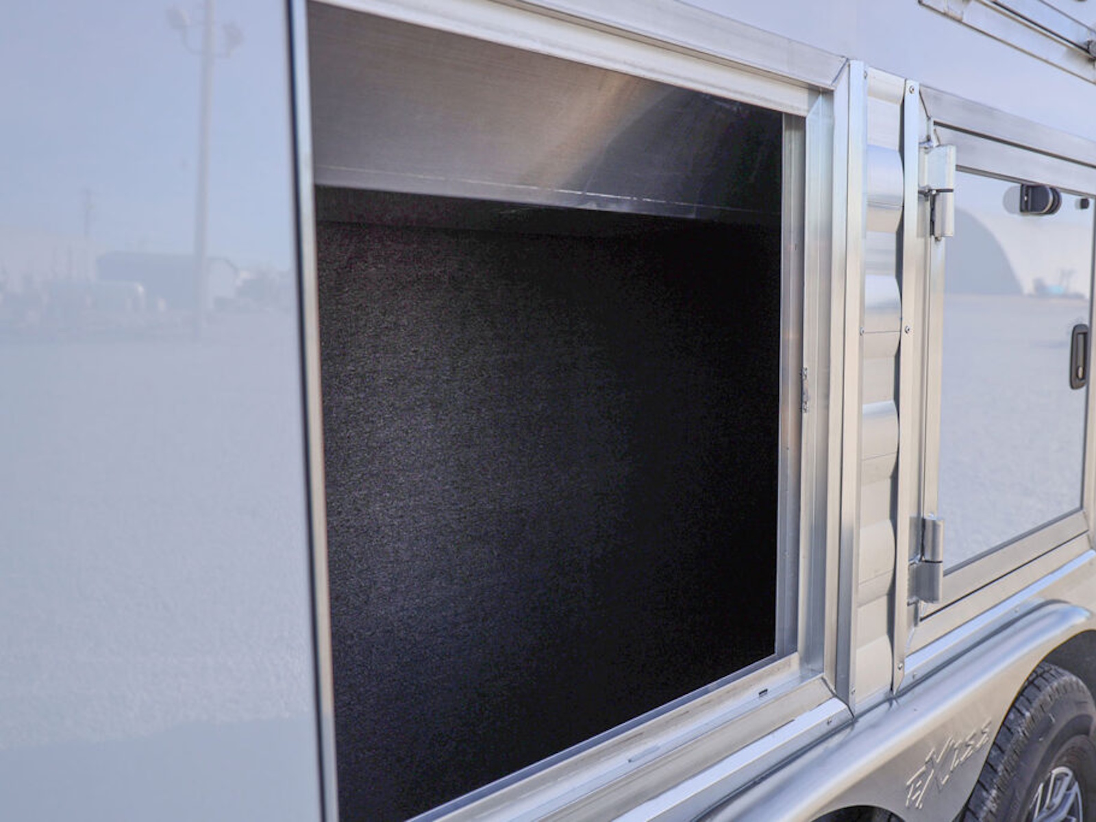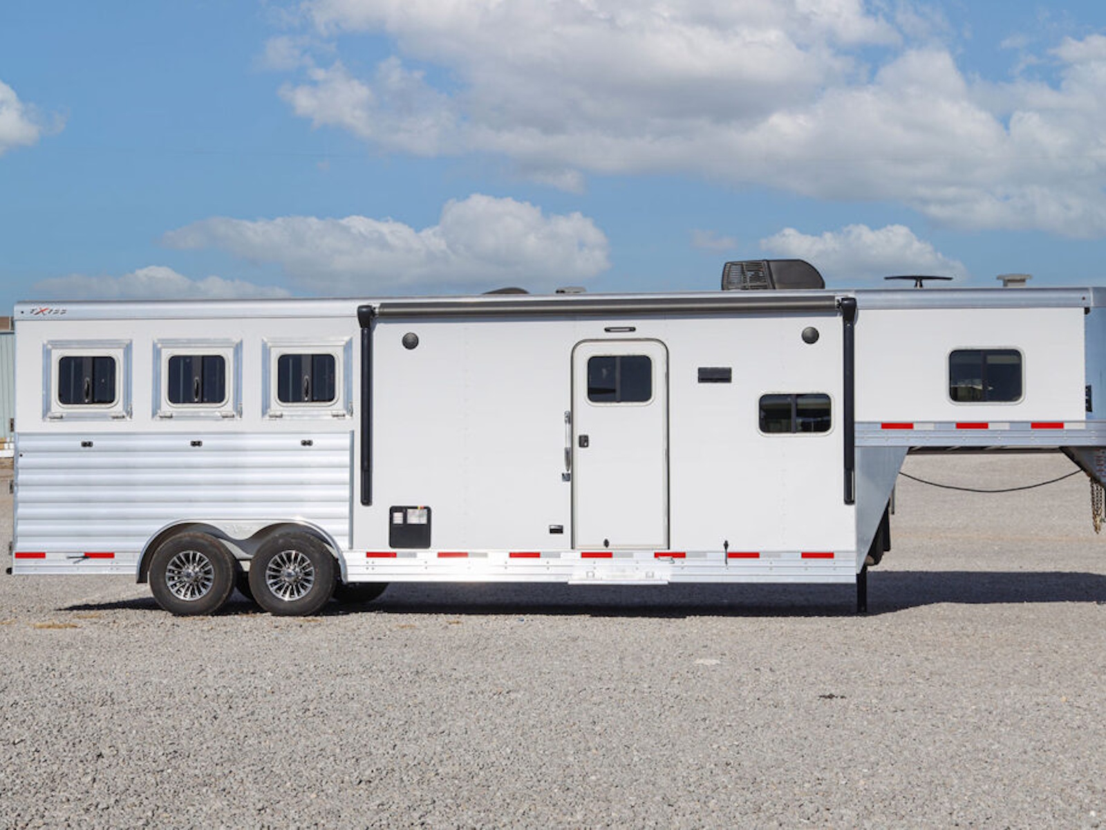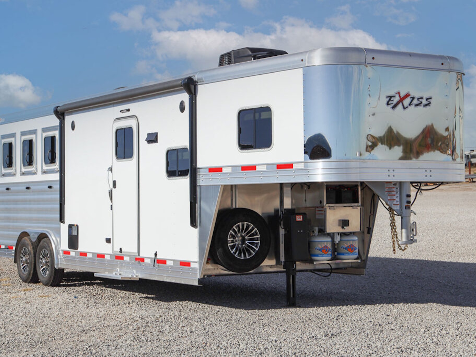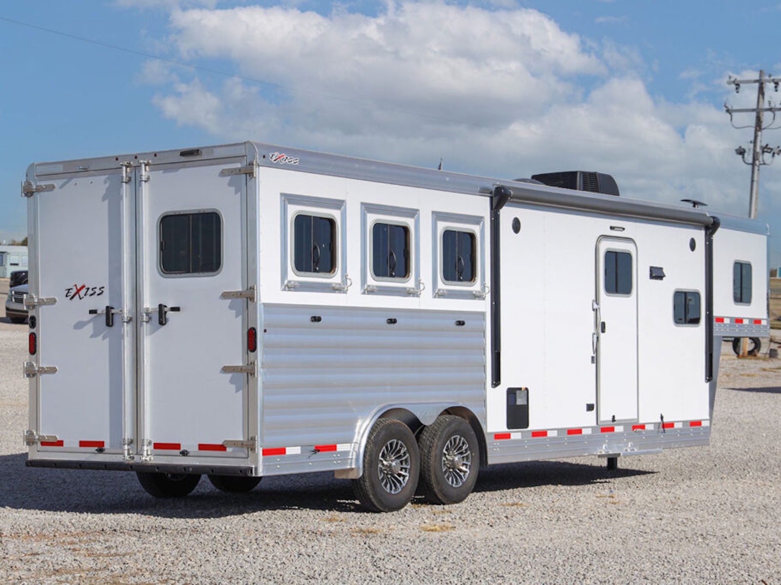 - A convenient electric awning is standard with Exiss living quarters, providing sun protection when relaxing outside your horse trailer. LED lighting is part of the awning for extra light at night.