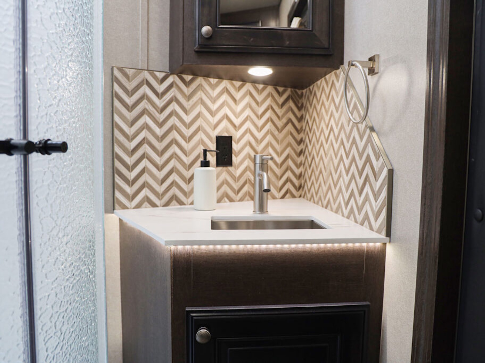 - Living quarters décor packages in Exiss living quarters trailers come standard with a stylish full height backsplash in the kitchen and bathroom.