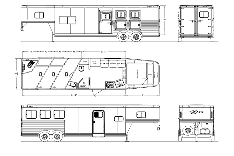 The 10′ living quarters floorplans are our most popular models from the family of Exiss 8′ wide living quarters horse trailers. Available in 2, 3 and 4 horse models, these trailers feature an extremely spacious and versatile horse area, along with a roomy living quarters area with a new updated modern sofa, tons of storage and a fully functional kitchen and bathroom. Choose from one of our new interior decor packages – Brownstone Latte, Glacier Ash or Urban Saddle.