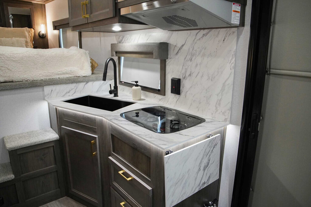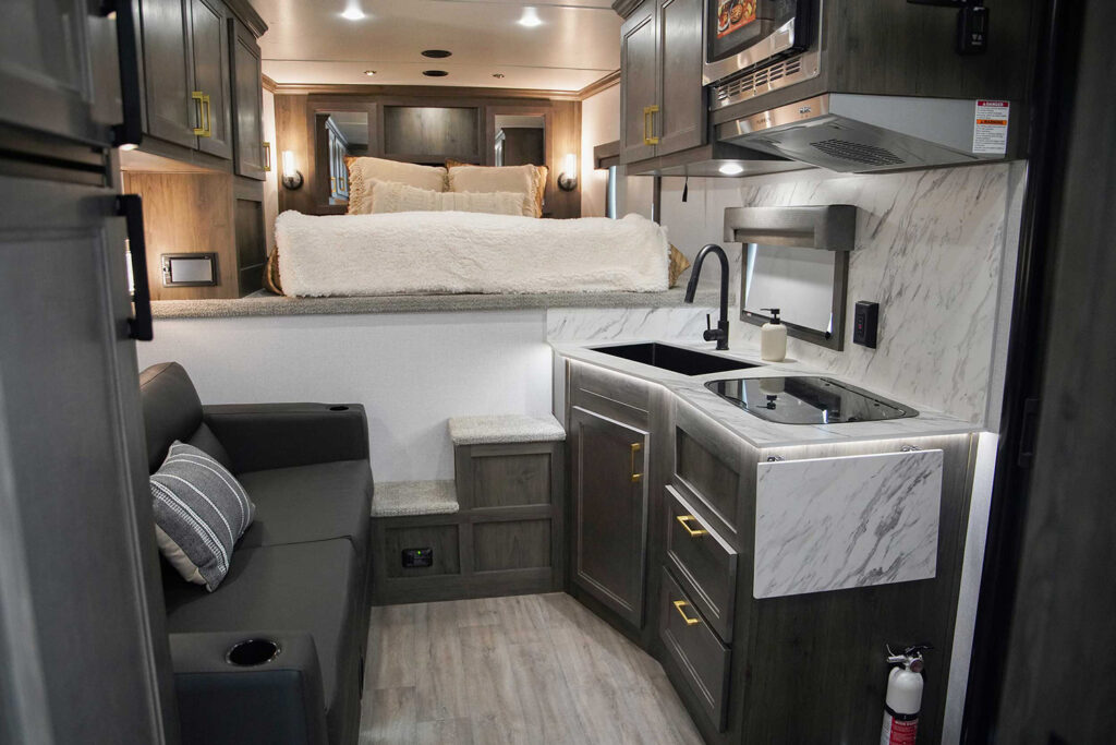 - Exiss living quarters feature an upgraded, larger convection microwave standard, which gives horse owners even more convenience and cooking options when traveling. The kitchen sink is a deep, extra large undermount style with stylish, upgraded faucets. And the recessed stainless steel cooktop stove is convenient and provides an additional flat surface for additional counter space.