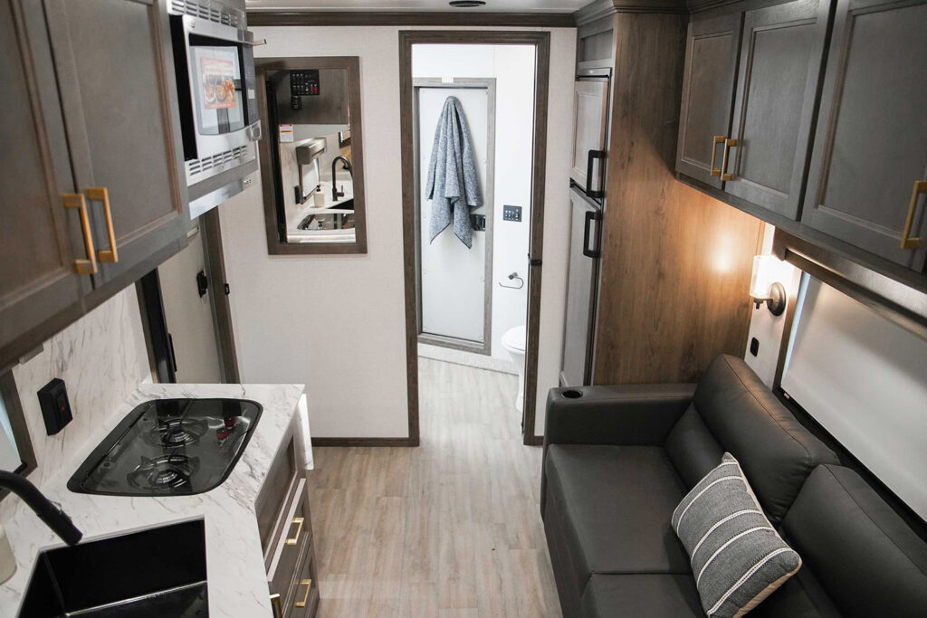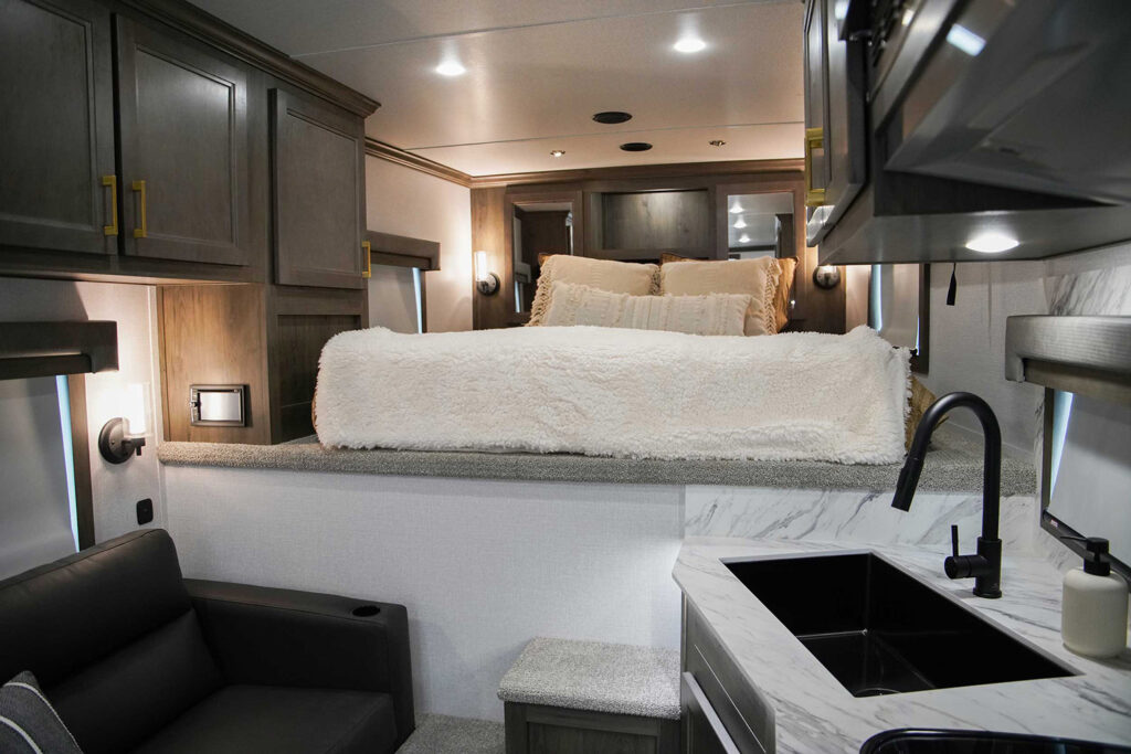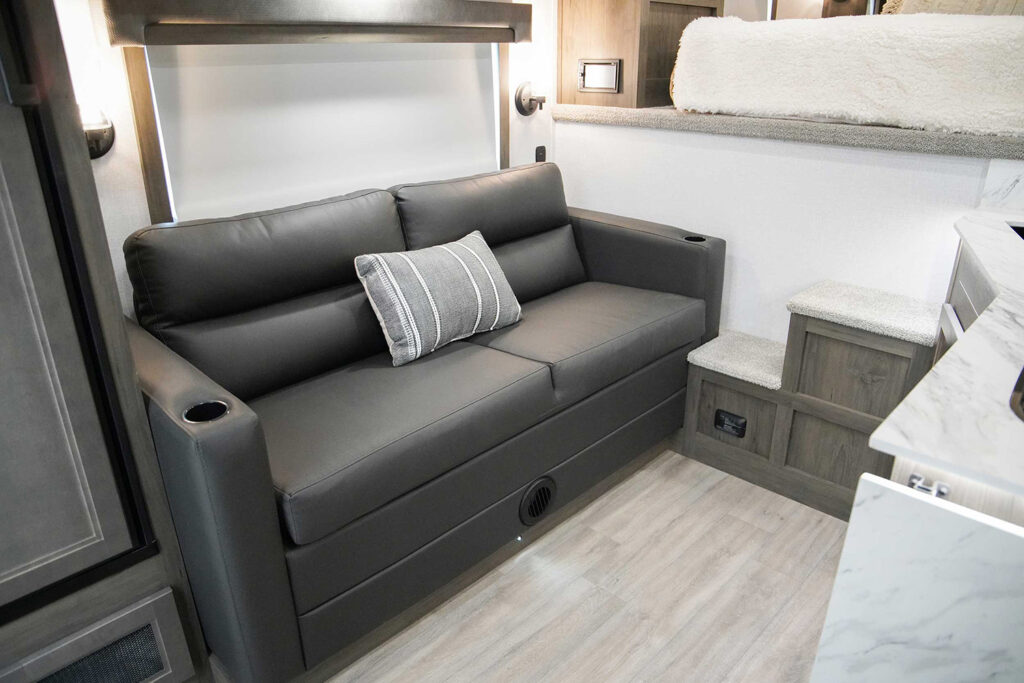 - Exiss living quarters now come with our redesigned sofas. These modern sofas feature cupholders with USB chargers behind the sofa. They easily fold down for extra sleeping space inside the interior.