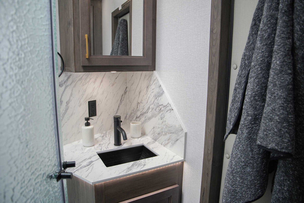 - New modern THINSCAPE® solid surface countertops are standard in Exiss living quarters trailers. The sleek design also comes with superior durability.