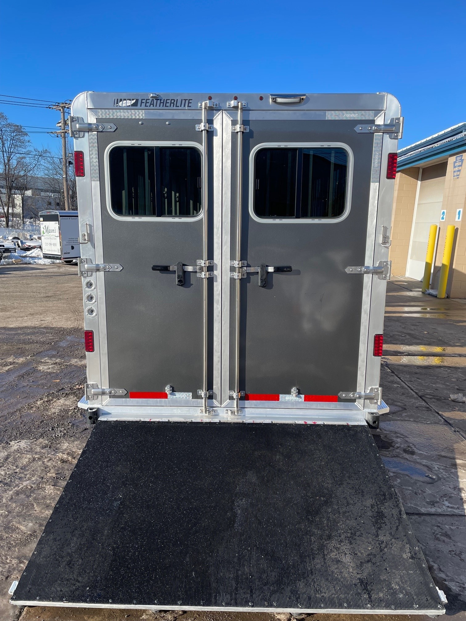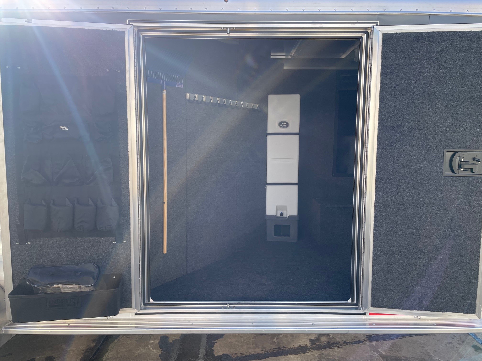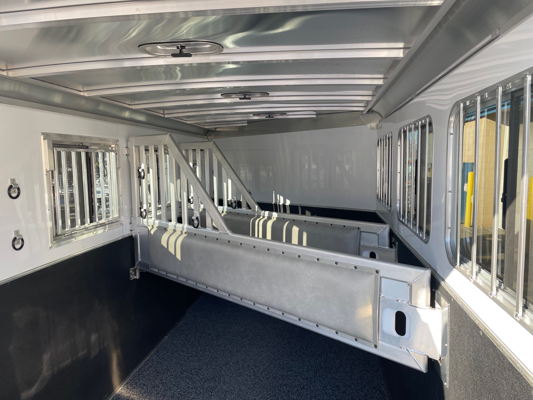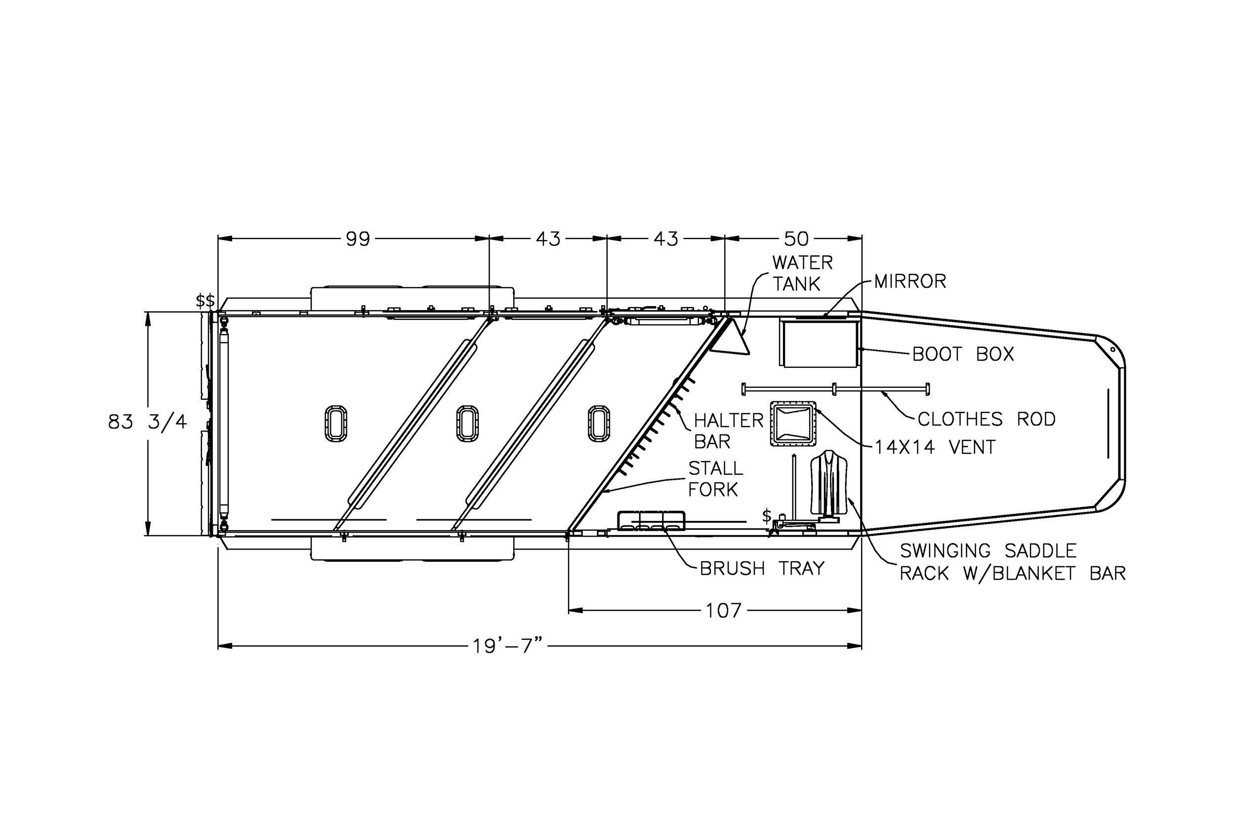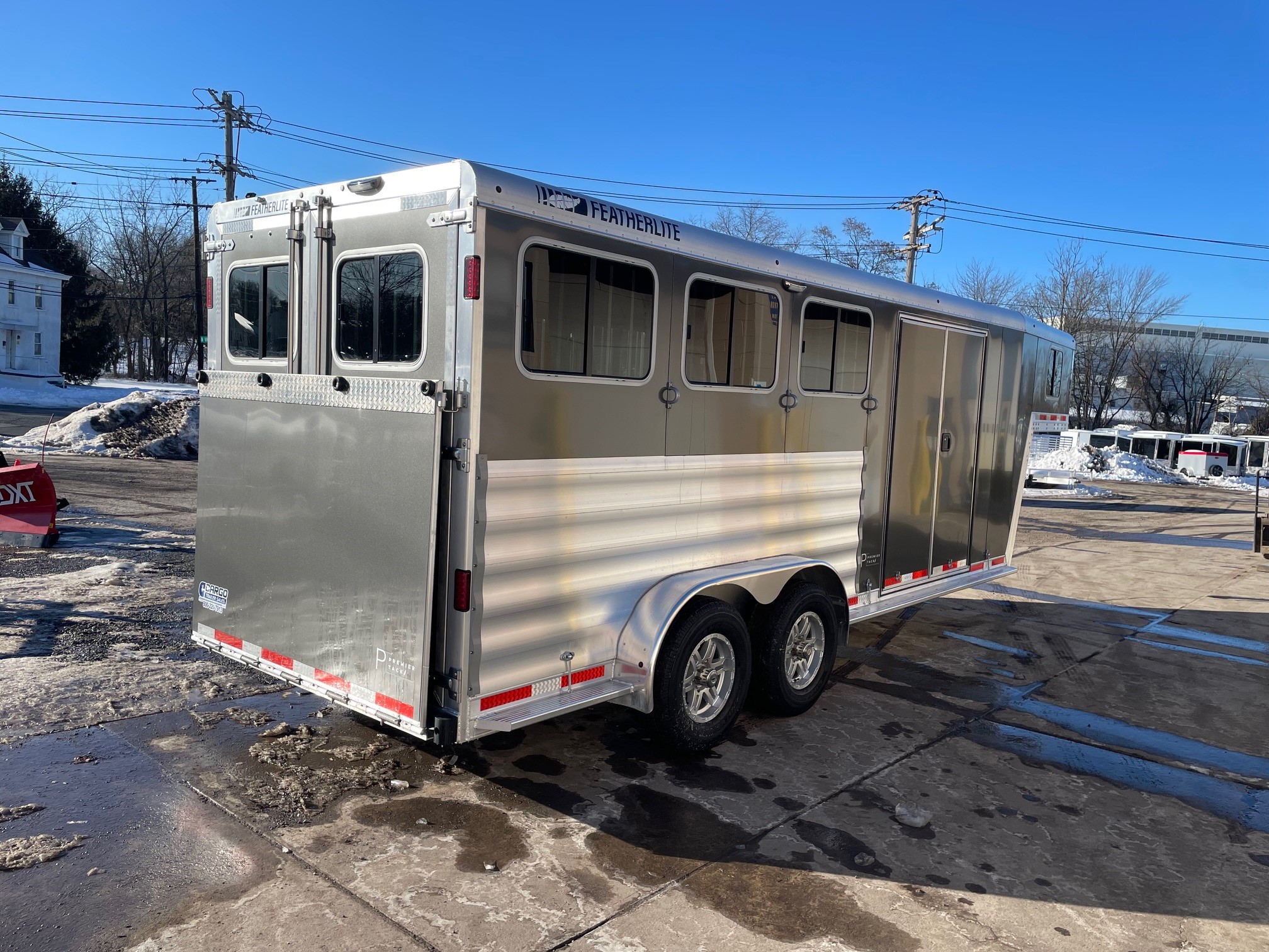 2026 Featherlite 9600. The 9600 includes a number of standard features like Air Flo dividers, matching spare tire, rear LED load light, white lining on the walls, one exterior tie ring per horse per side and much more. 7' Wide 19' 7" Long 3 Horse Slant Load, 7' Interior Height, Easy Care Flooring, Full Width Rear Ramp, Charcoal Exterior, Premier Tack Package, 50" Short Wall, The premier tack package is an enhanced tack room with extra amenities and easy access awaits horse owners in the Model 9600 Premier Tack. The 9600 Premier Tack features a 60” x 74” square double door and a 50” short wall dressing room. Features inside the tack area include a storage box, upright water caddy, turf, hanging clothing rod, stable fork, mirror and more.