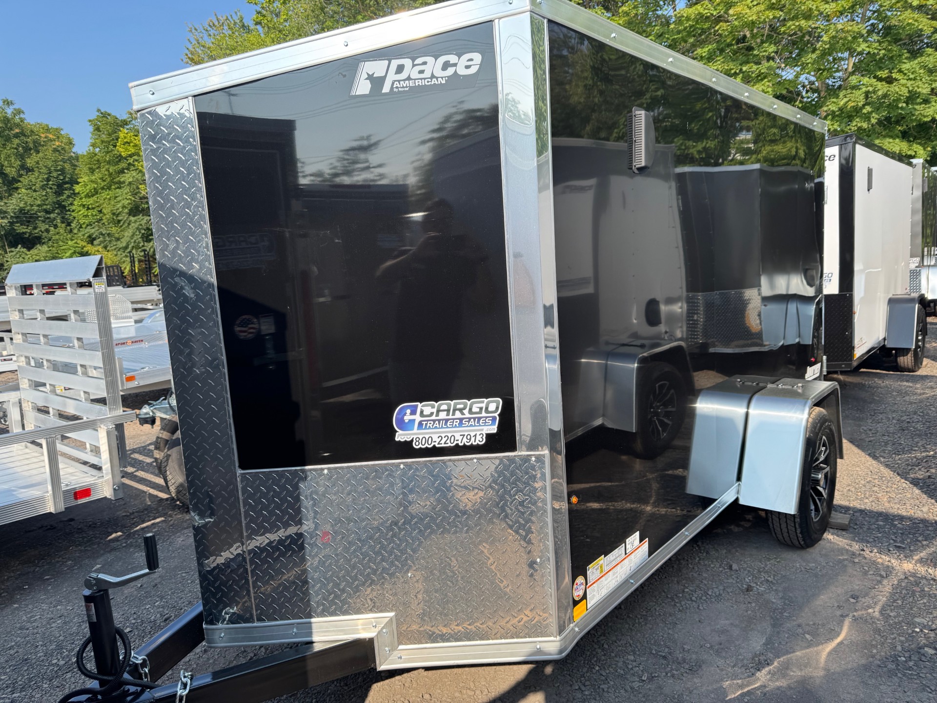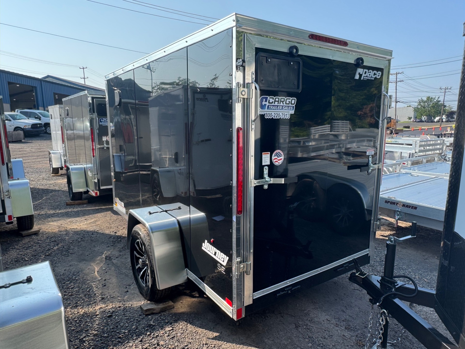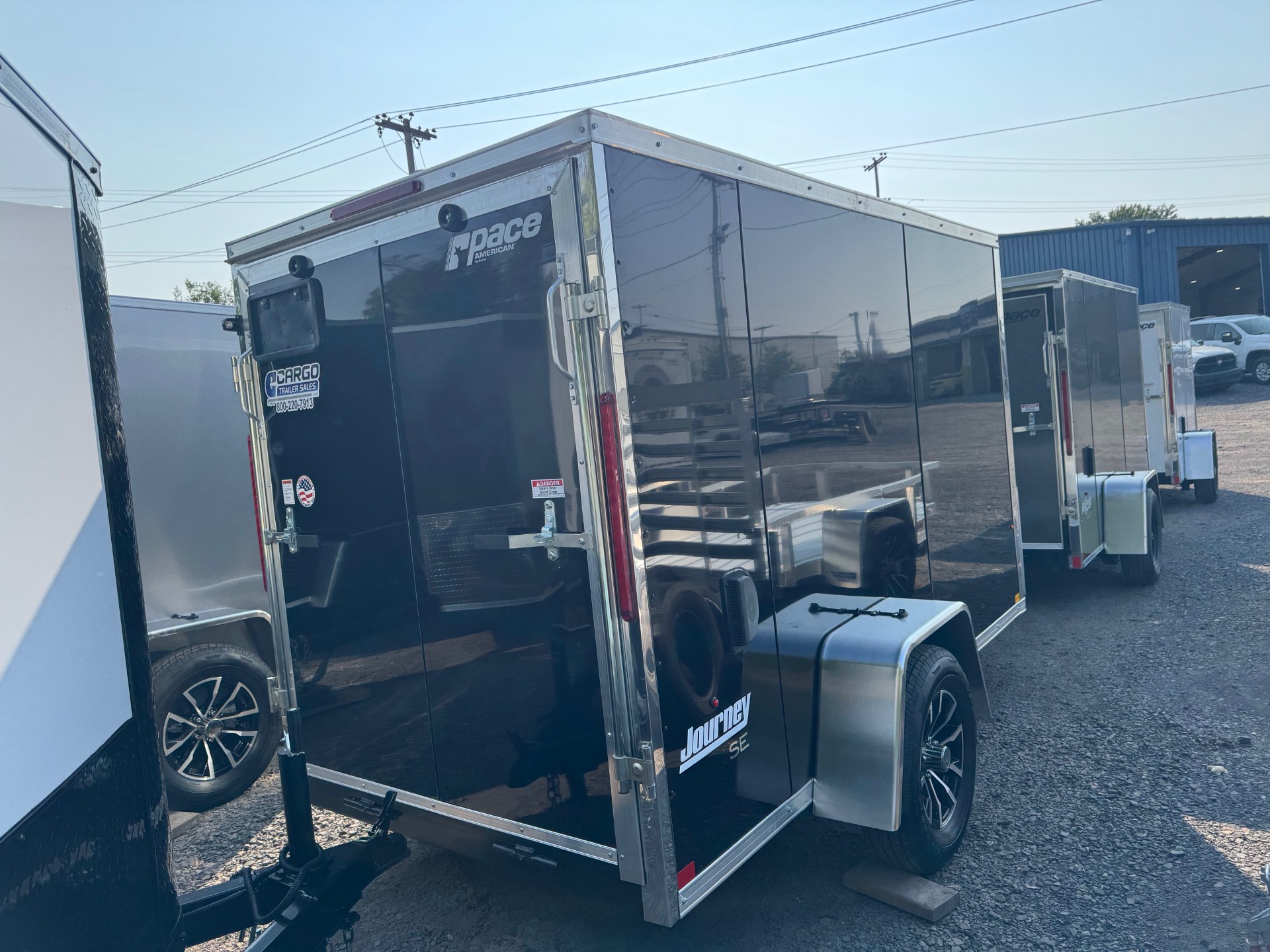 The Journey SE is our Mid-grade offering from Pace American. It is built with a lot of the same features that you will find on higher end models at a more affordable price. These features include 16” on center floor joists and full tube steel wall studs, a one piece aluminum roof, screw-less exterior, and a 3 year warranty. The Journey is the model that we recommend for lighter commercial use, or someone who is looking for the nicer looks of the screw-less sides and added support of the additional framing without breaking the bank. 2025 Pace American Journey SE, 5x10, Black, Ramp Door, Aluminum Wheels, Empty Weight 1183, GVWR, 2990