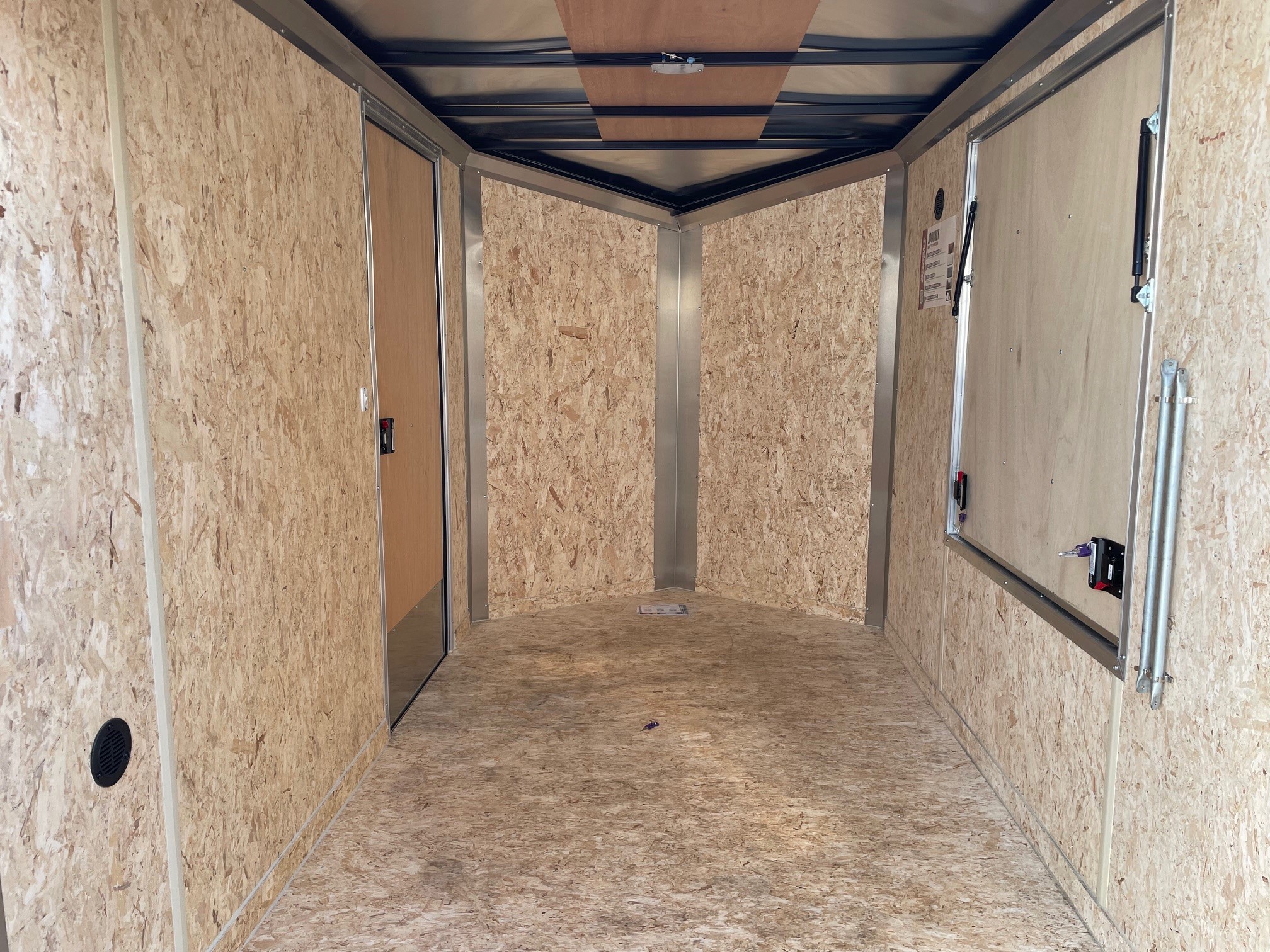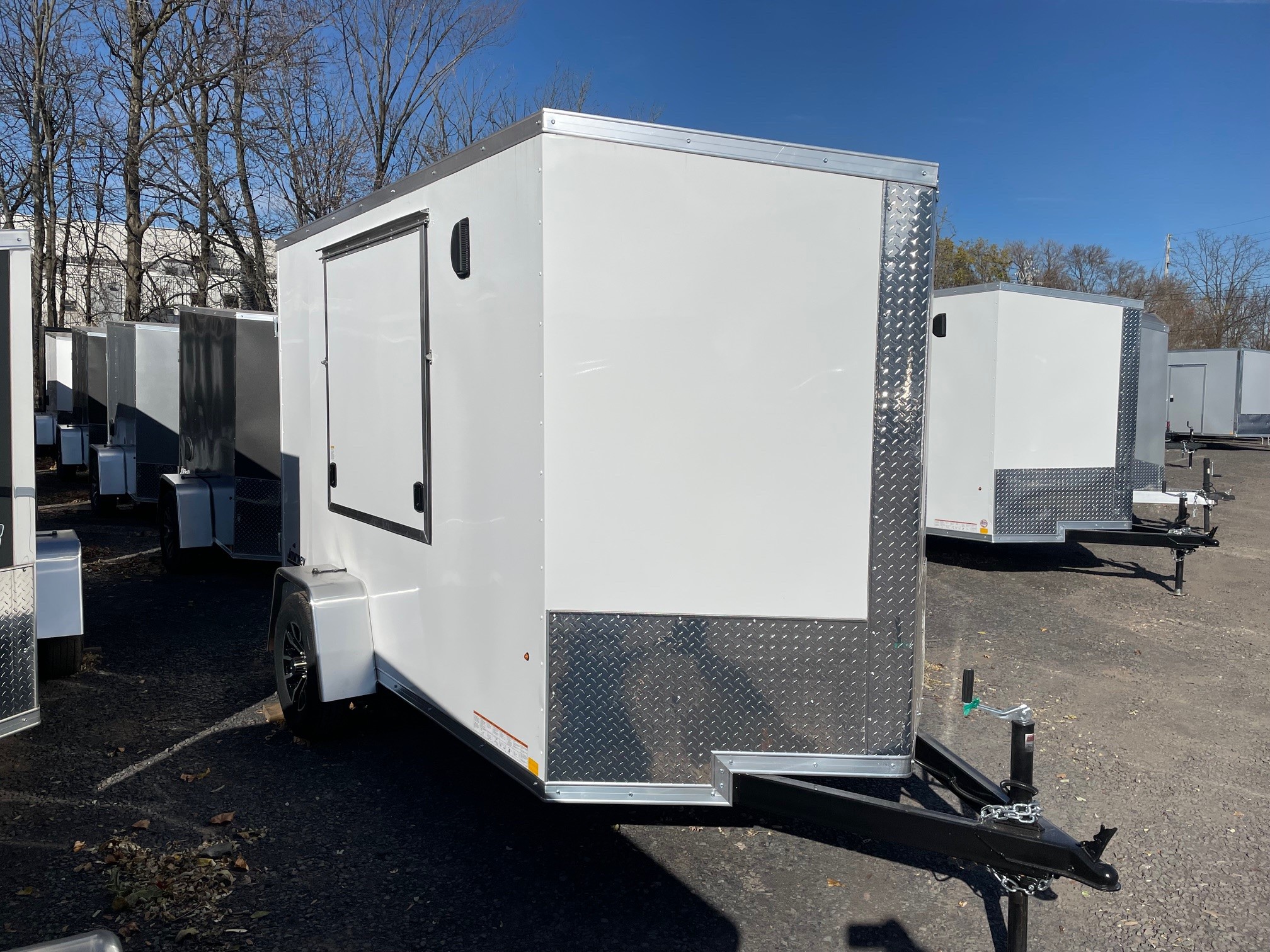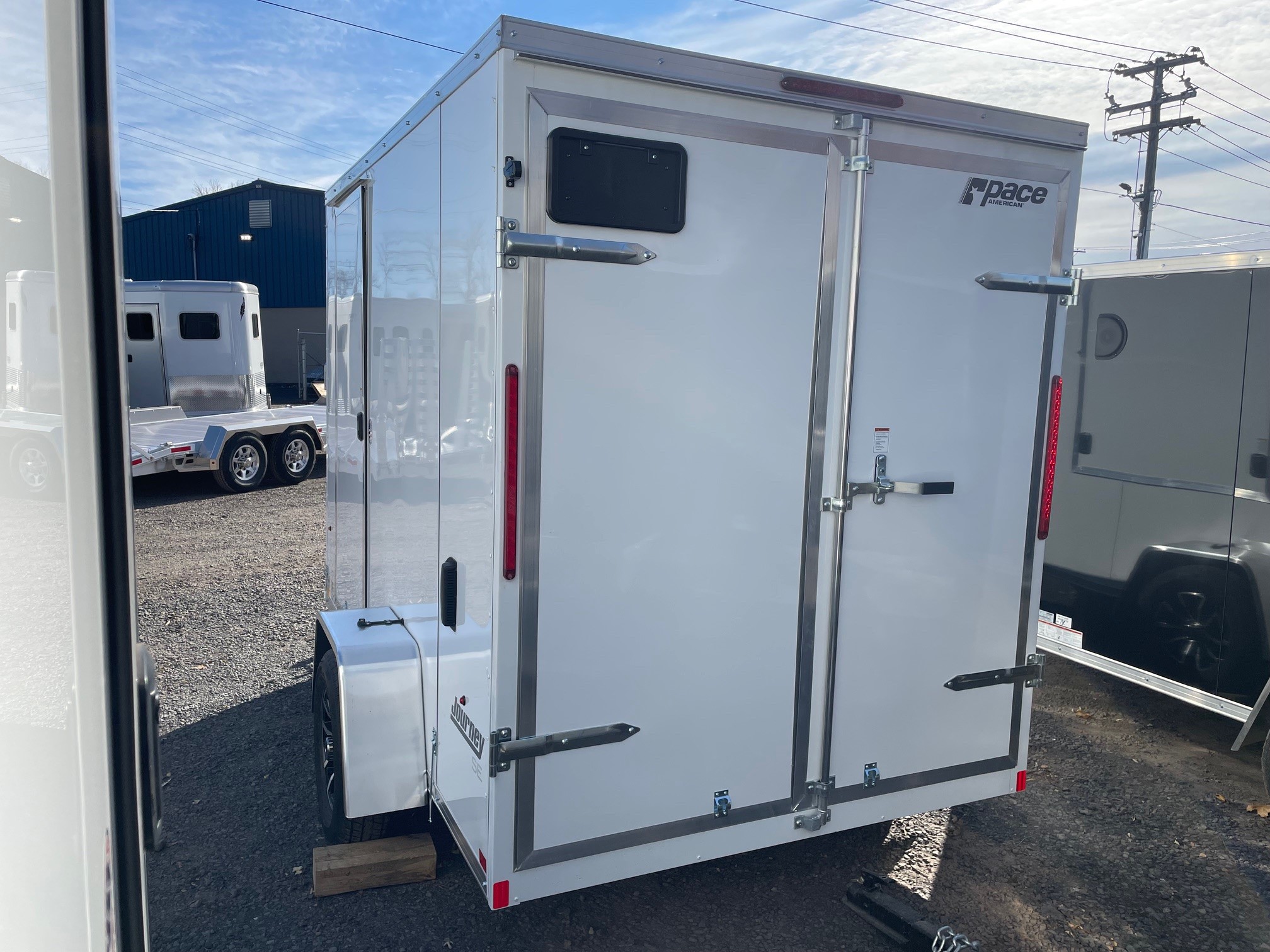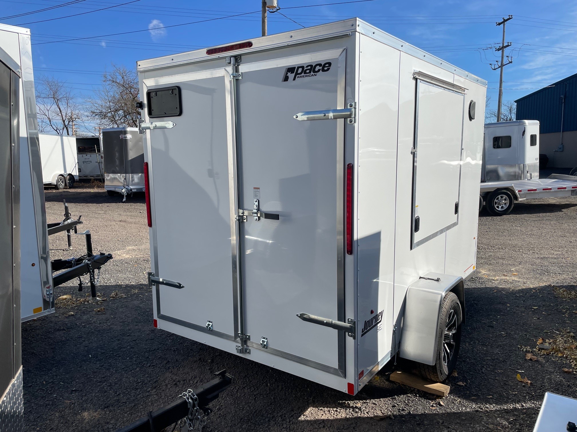 The Journey SE is our Mid-grade offering from Pace American. It is built with a lot of the same features that you will find on higher end models at a more affordable price. These features include 16” on center floor joists and full tube steel wall studs, a one piece aluminum roof, screw-less exterior, and a 3 year warranty. The Journey is the model that we recommend for lighter commercial use, or someone who is looking for the nicer looks of the screw-less sides and added support of the additional framing without breaking the bank. 6x10, White, Pace American Journey SE, Double Rear Doors, Side Door, 48 x 48 Inch Concession Door, Aluminum Wheels, GVWR-2990#, Empty-1310#