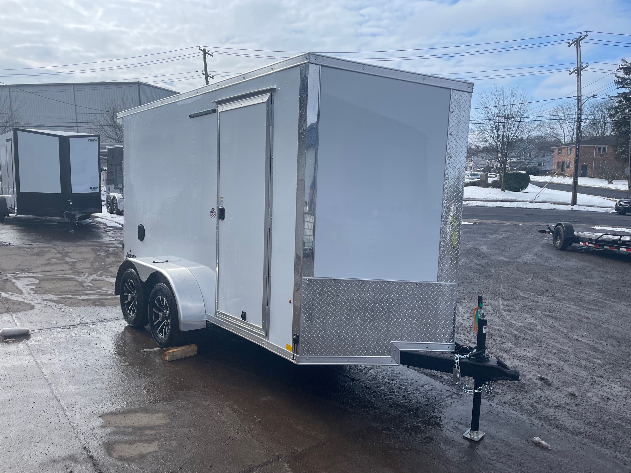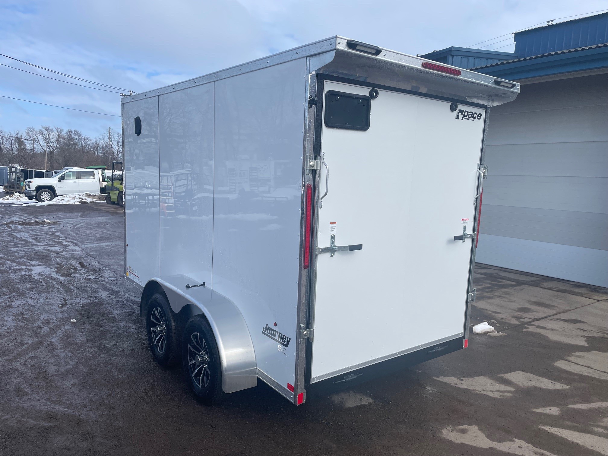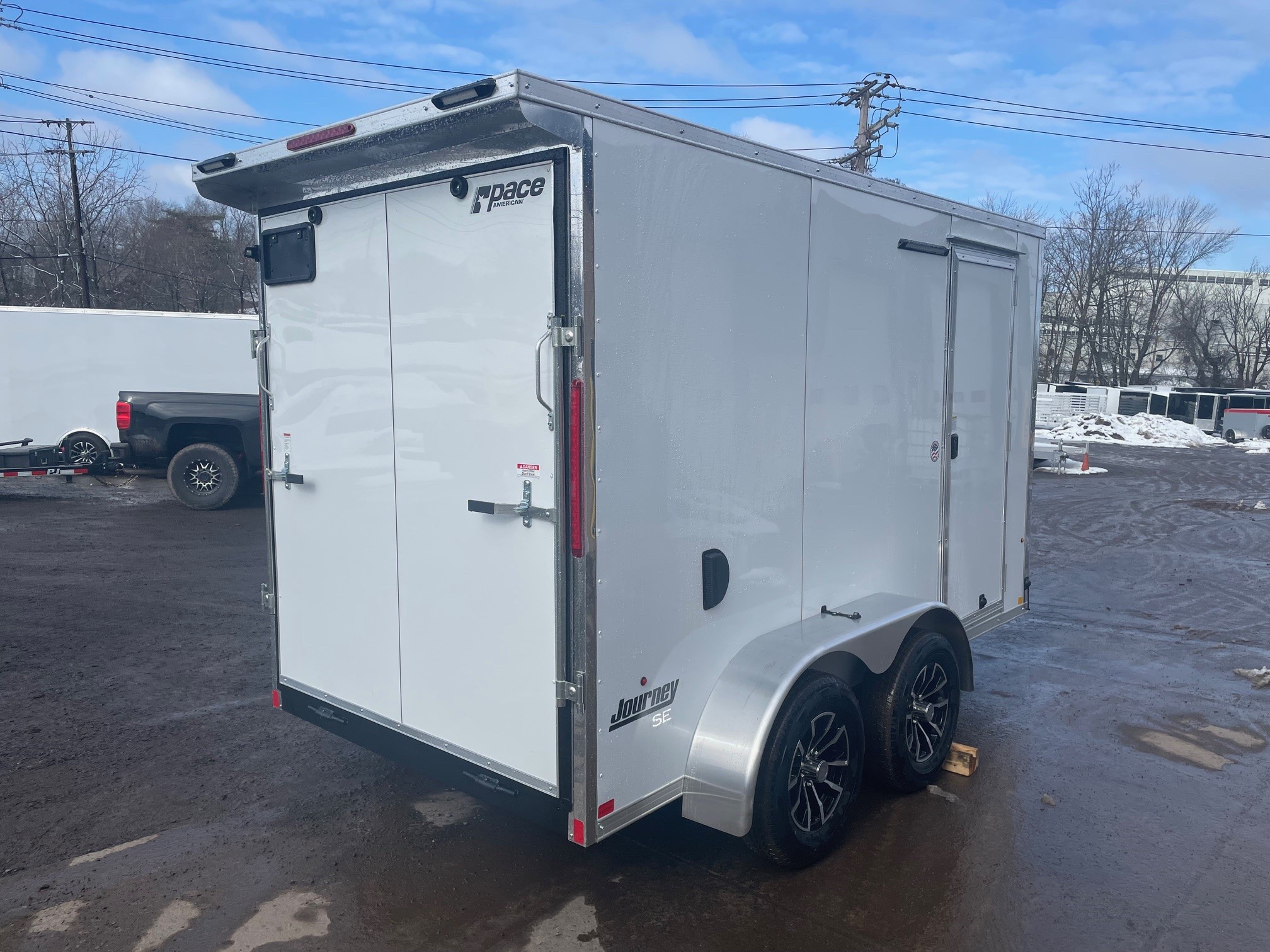 The Journey SE is our Mid-grade offering from Pace American. It is built with a lot of the same features that you will find on higher end models at a more affordable price. These features include 16” on center floor joists and full tube steel wall studs, a translucent roof to allow for more interior light, screw-less exterior, and a 3 year warranty. The Journey is the model that we recommend for lighter commercial use, or someone who is looking for the nicer looks of the screw-less sides and added support of the additional framing without breaking the bank 6x12+2, White, 2026 Pace American Journey SE, Tandem Axle, Ramp Door, Side Door, Composite Exterior, Rear Spoiler w/ Loading Light, Loading Light at Side Door, Aluminum Wheels, GVWR-7000#, Empty-1558#