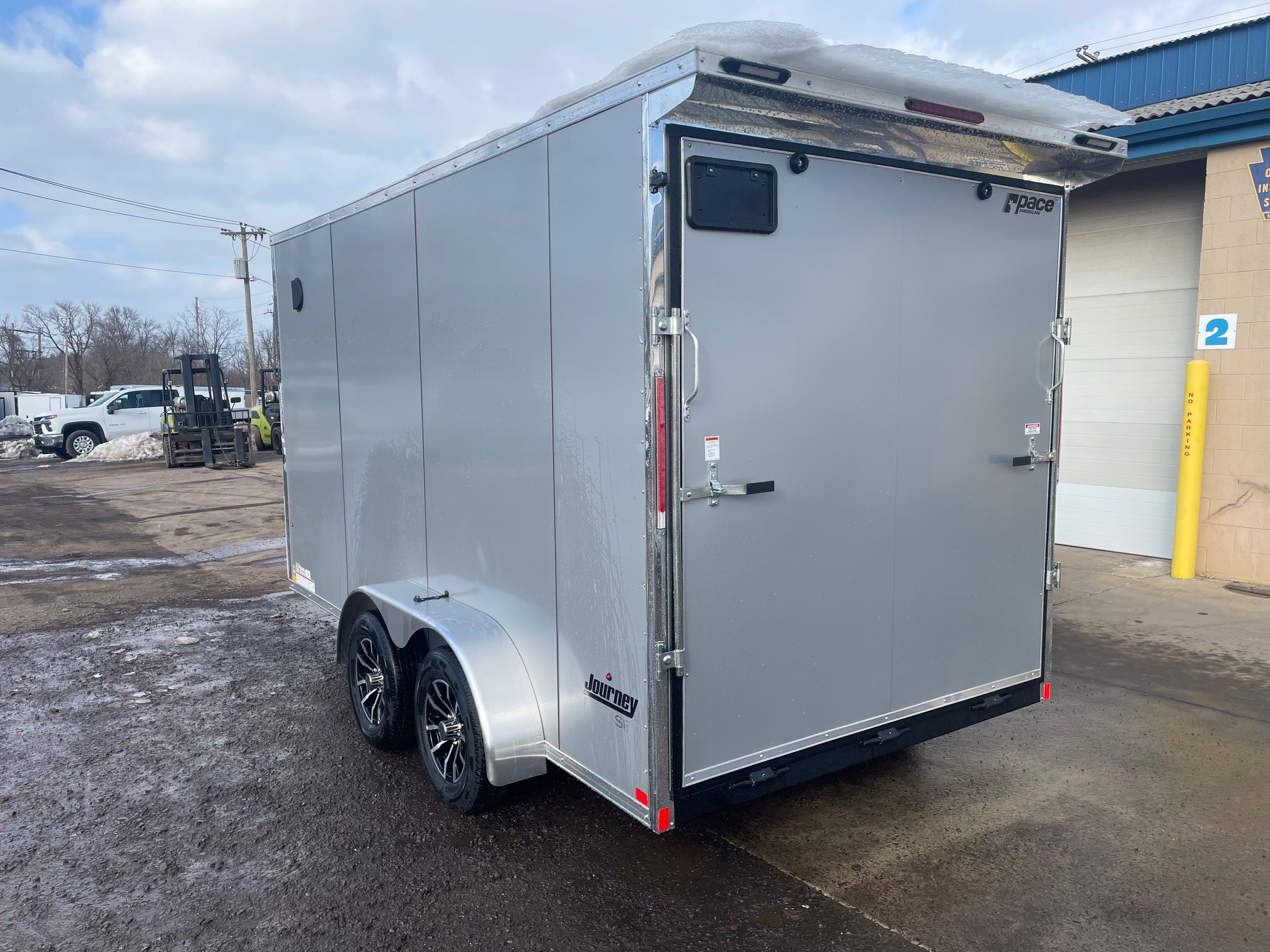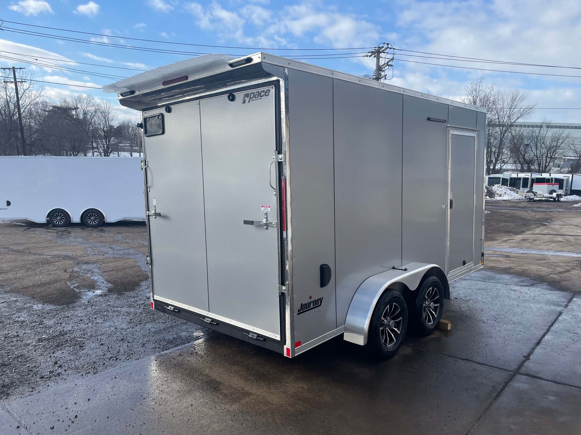 The Journey SE is our Mid-grade offering from Pace American. It is built with a lot of the same features that you will find on higher end models at a more affordable price. These features include 16” on center floor joists and full tube steel wall studs, a translucent roof to allow more interior light, screw-less exterior, and a 3 year warranty. The Journey is the model that we recommend for lighter commercial use, or someone who is looking for the nicer looks of the screw-less sides and added support of the additional framing without breaking the bank 7x14+2, Silver, 2026 Pace American Journey SE, Ramp Door, Side Door, Ramp Door, Aluminum Wheels, Rear Flair w/ Loading Lights, Scene Light, GVWR-7000#, Empty-2239#