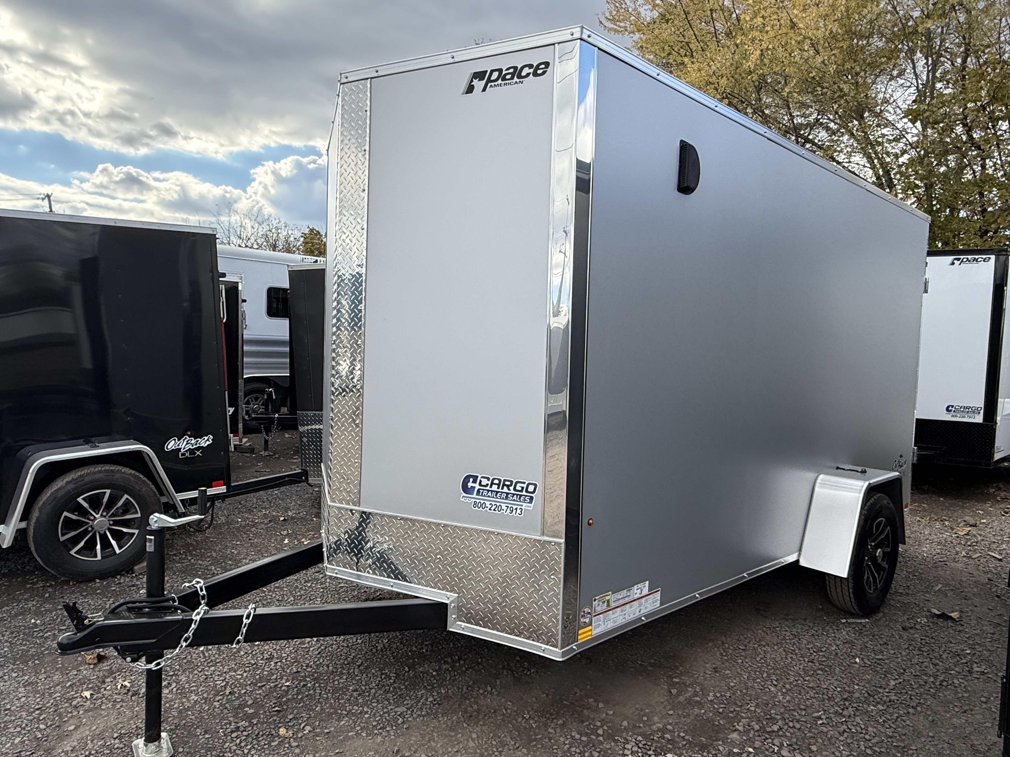 The Outback DLX is our Entry level model from Pace American. It’s great for lighter duty use which makes it a great fit for homeowners and other light duty applications. The Outback has standard features such as 24” on center framing, 0.030 exterior aluminum, color matching exterior screws, a one piece roof and a 3 year warranty. The Outback is our economical, yet reliable enclosed trailer offering to keep you on the road without breaking the bank. 6x12+2, Silver, Pace American Outback DLX, Side Door, Rear Barn Doors, 6.5' Interior Height, Upgraded Composite Exterior, Upgraded 16" OC Tube Wall Posts, Aluminum Wheels, GVWR-2990#, Empty-1336#